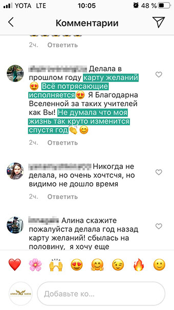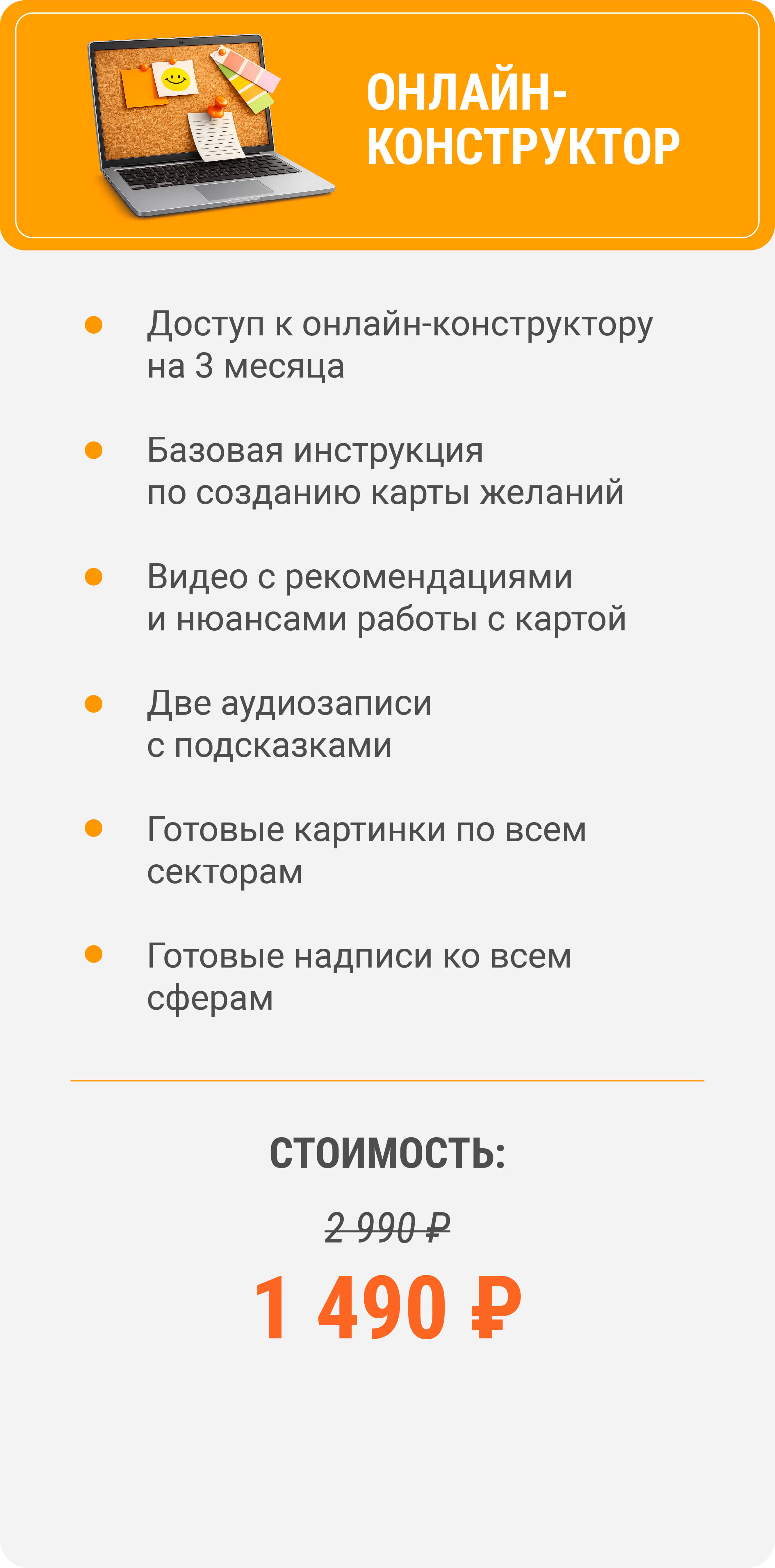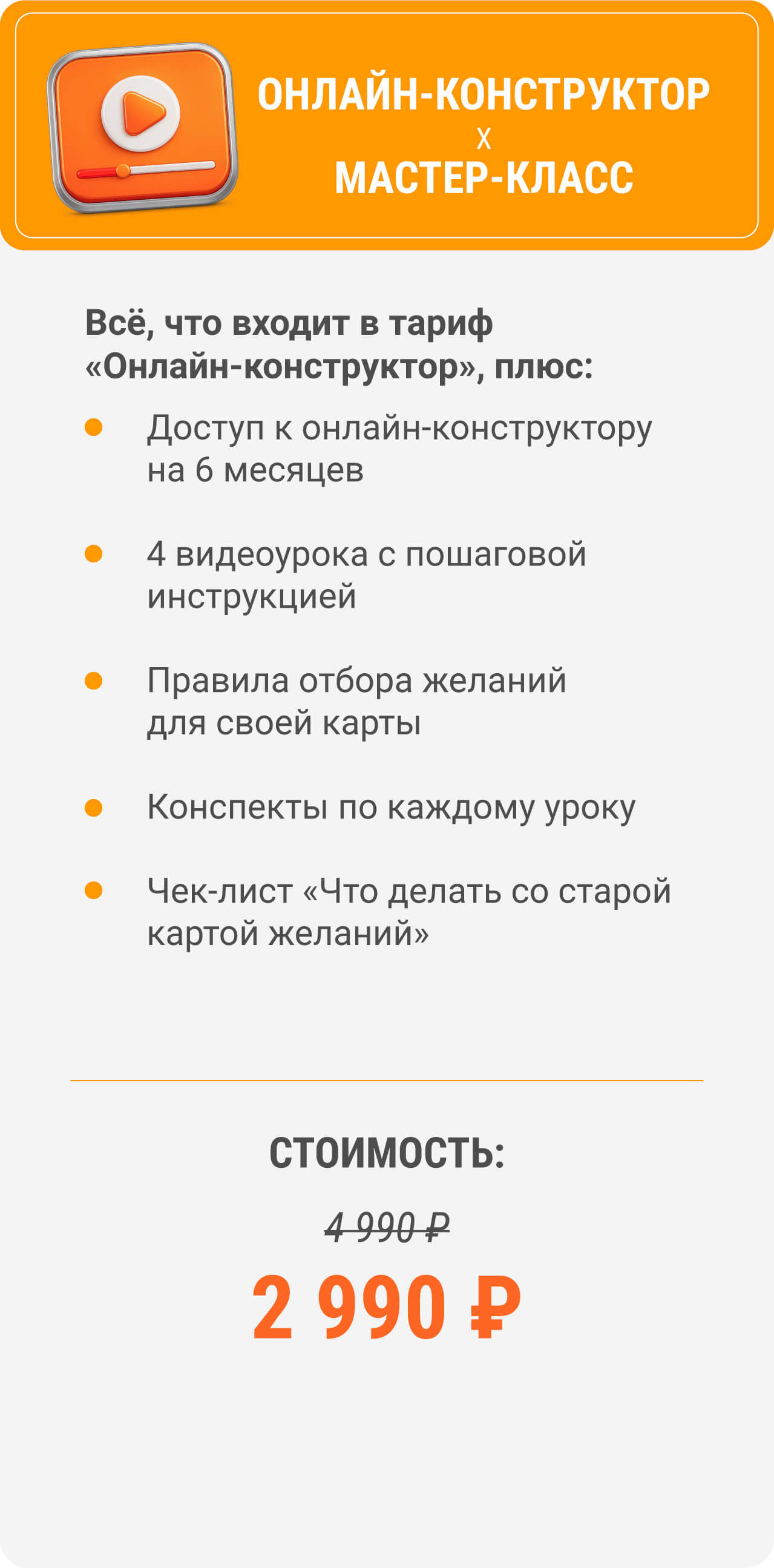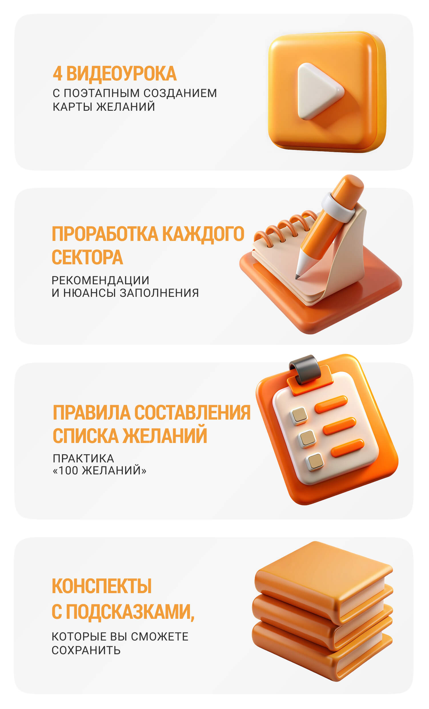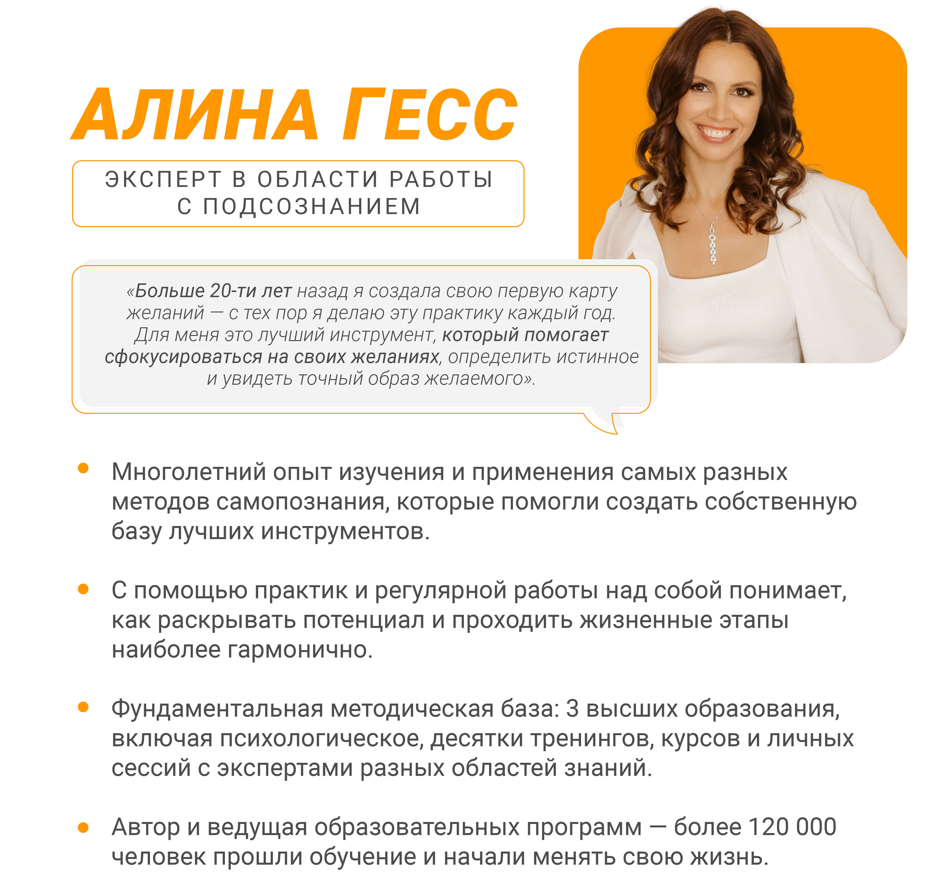У вас будет подробная инструкция, видео и аудио рекомендации по созданию карты желаний от Алины Гесс. Вы точно сделаете все правильно.