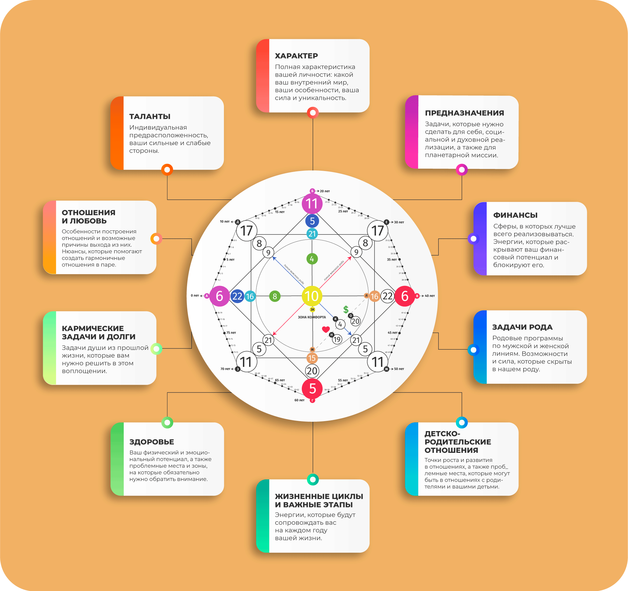 - Самое главное – с помощью этого инструмента вы сможете понять, какие возможности в вас скрыты, какой потенциал, таланты и предназначения. Увидите, как проявляются ваши особенности характера, какие важные моменты есть в разных сферах жизни. Сможете лучше понять себя и своих близких, а также научитесь составлять прогнозы на годы вперед, чтобы понимать, как лучше реализовываться в своей жизни.