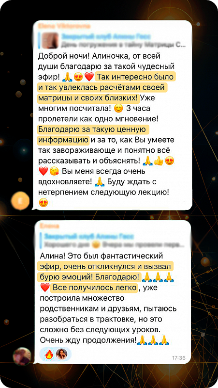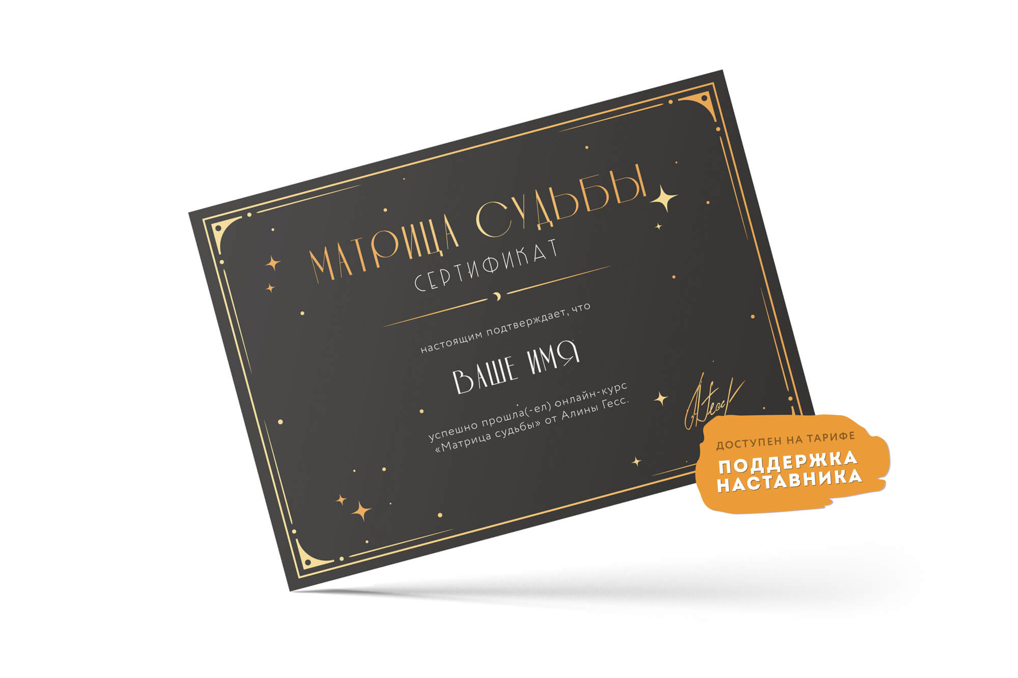 Принципиальная разница в том, что в тарифе «Поддержка наставника» вас будет сопровождать наставник – специалист, который работает с инструментом «Матрица судьбы». Он будет отвечать на ваши вопросы, помогать с материалами и поддерживать. Также в этом тарифе предоставляются краткие конспекты ко всем материалам, которые будут для вас настоящими помощниками после прохождения программы. А еще на этом тарифе предусмотрены разборы матриц знаменитых людей от Алины, которые помогут закрепить ваши практические навыки.