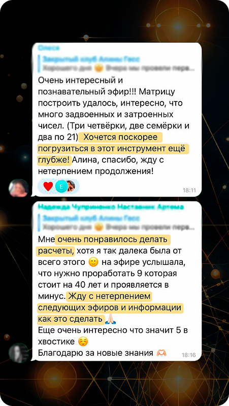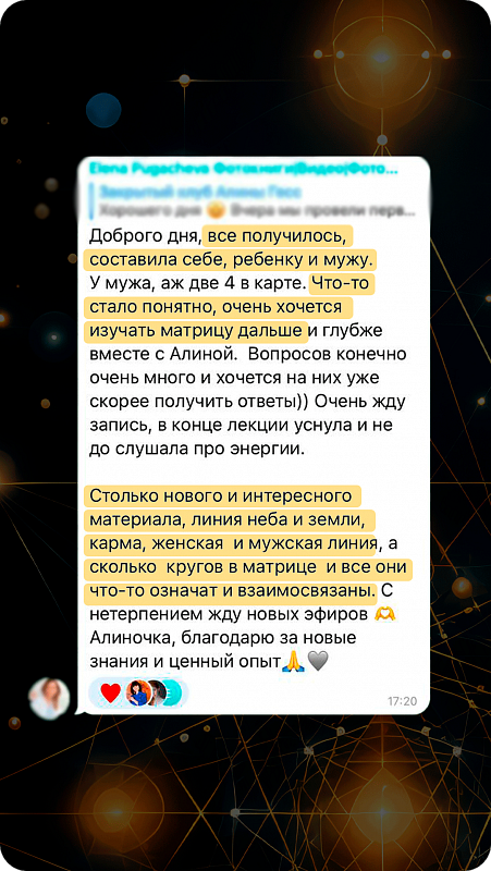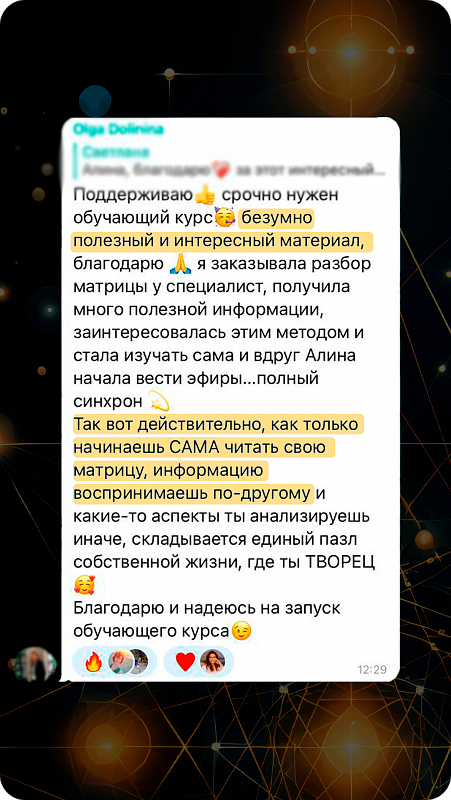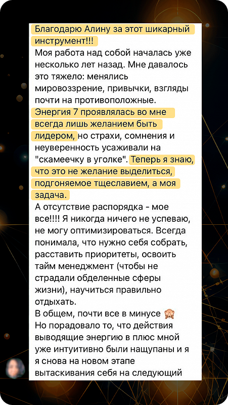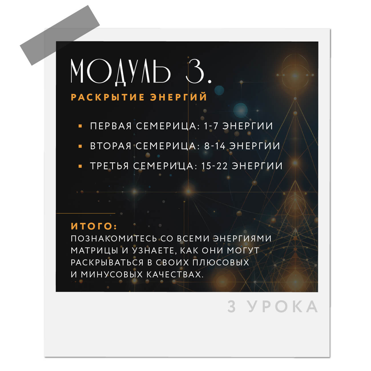 Самая кропотливая работа – изучение всех энергий и их взаимосвязей. Но когда вы пройдете все уроки программы, вы сможете прочитать свою матрицу. Более того, мы убеждены, что лучше нас самих никто не может расшифровать то, что в ней зашифровано.