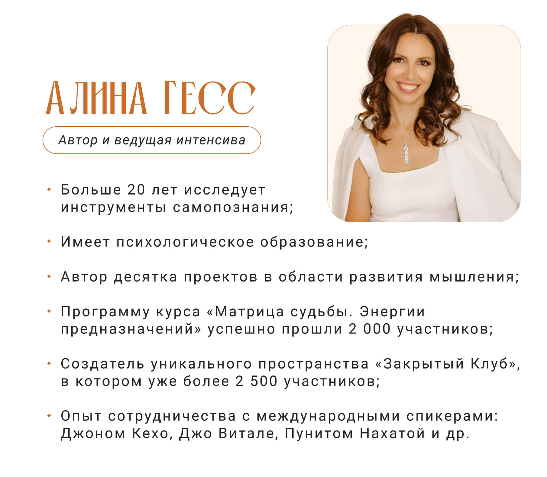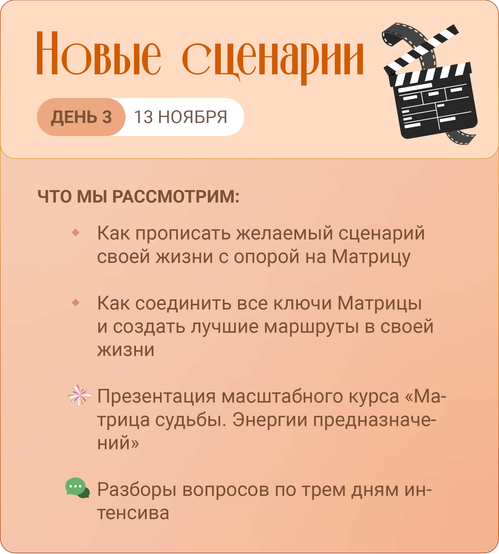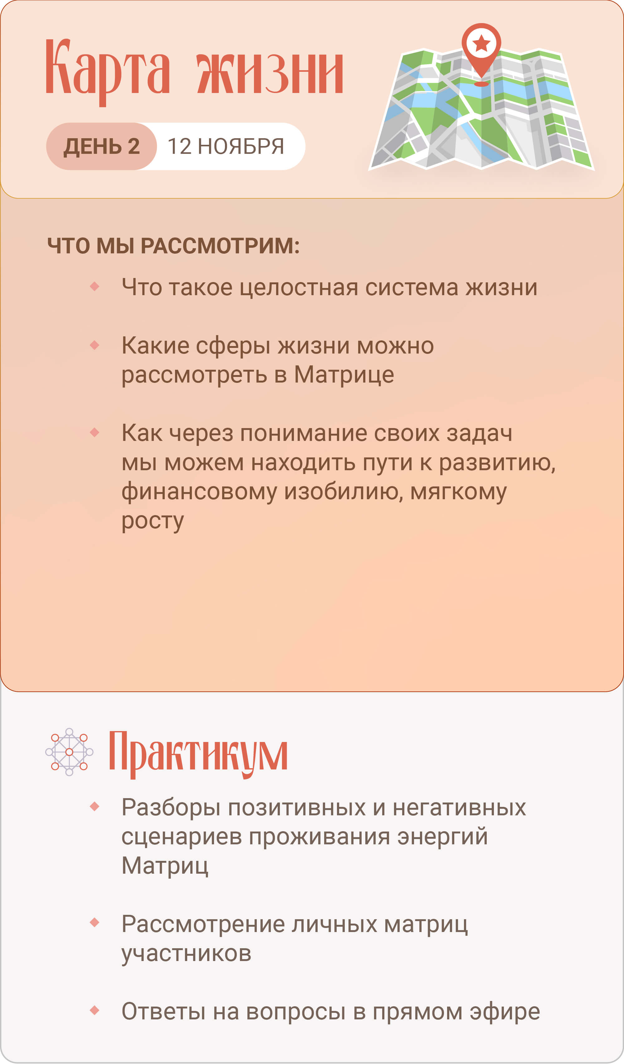 На трехдневном интенсиве мы будем раскрывать свою карту жизни с помощью Матрицы судьбы и смотреть, как мы можем направлять себя и создавать лучшие события в своей жизни.